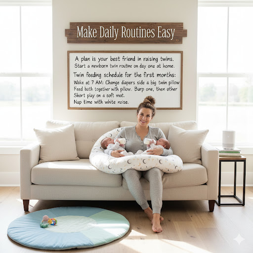 Start feeding both at the same time every 2–3 hours. Use a twin pillow. If one wakes early, gently wake the other. This keeps days and nights on track.