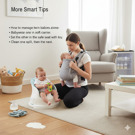That’s a lot of great tips for managing twins! Here’s an image that captures the essence of managing twin babies alone, showcasing one being baby-worn and the other in a safe seat with a toy, amidst a clean and organized home setting.