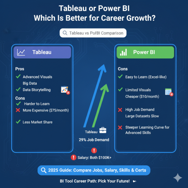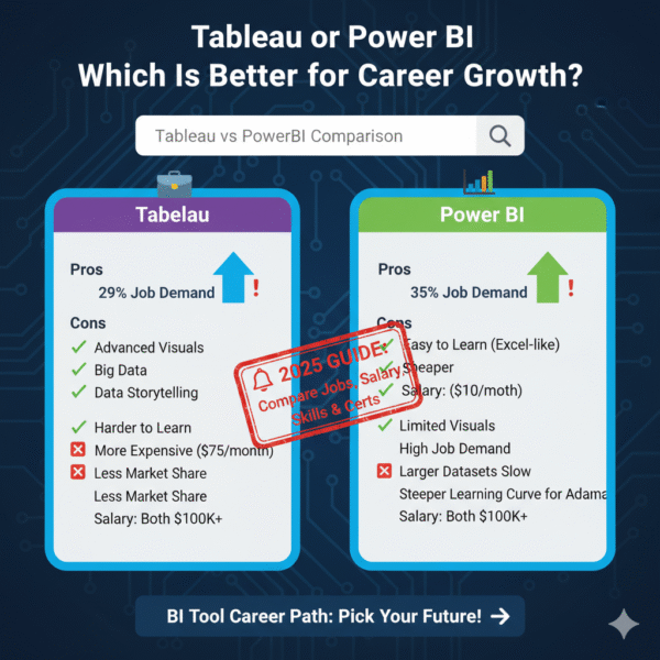 Tableau or Power BI which is better for career growth? Power BI wins for most in 2025. It has more jobs, lower cost, easier learning, and big company love. Tableau is great for deep viz and higher pay in some spots.