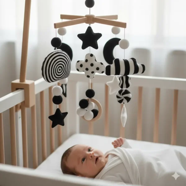 - High-contrast cards or mobiles – Hang above the crib. Baby stares and tracks with eyes. Builds focus and vision.