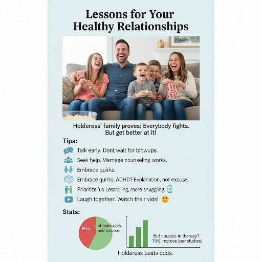 The Holderness family rumors stem from candid reflections. They joke about fights in videos. One clip: “Divorce court, here we come!” (Then, “Oops, never mind.”) Fans laugh, but some miss the punchline.